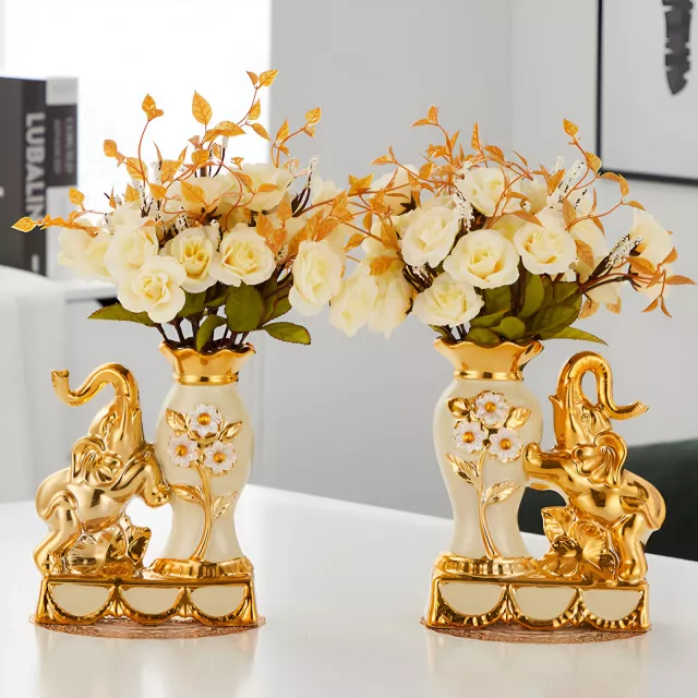 Crafted from high-quality ceramic, this vase features a beautiful golden finish that reflects light, creating a warm, inviting ambiance. The unique design showcases a majestic golden elephant, symbolizing strength and good fortune, making it a meaningful addition to your home or office. This exquisite piece effortlessly blends style with purpose, making it a must-have for those who appreciate the finer things in life.